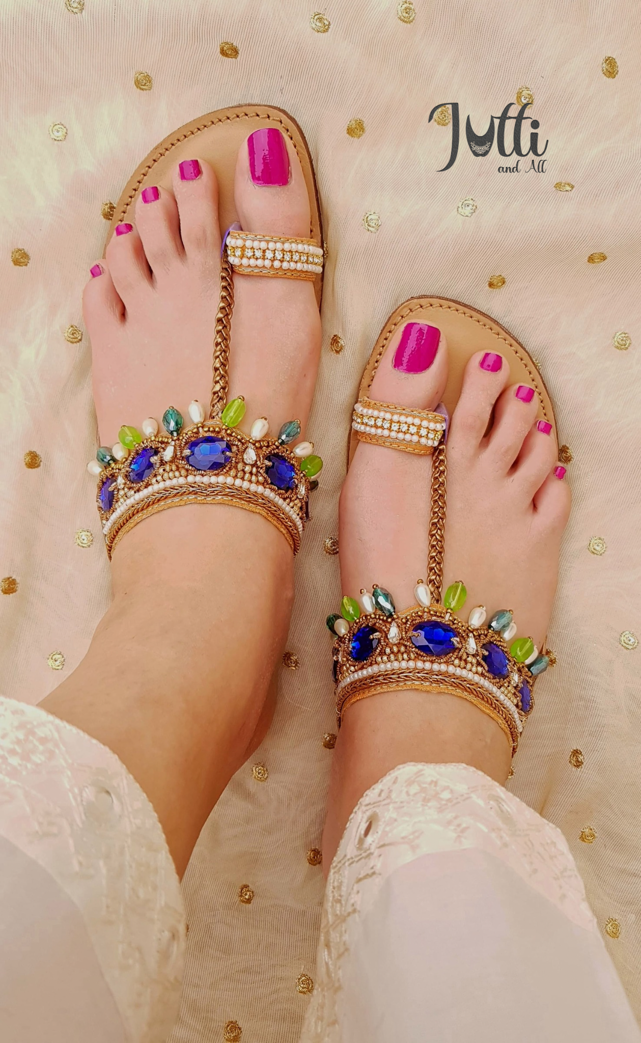 Royal blue stone work with antique dabka embroidery, finished off with teal crystal, parrot crystal and pearl drops